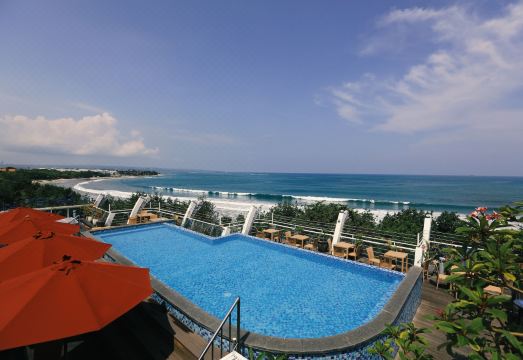 "꾸따의 붉은 노을을 품은 루프탑 수영장에서의 휴식은 발리 여행 최고의 선물이 될 것입니다."